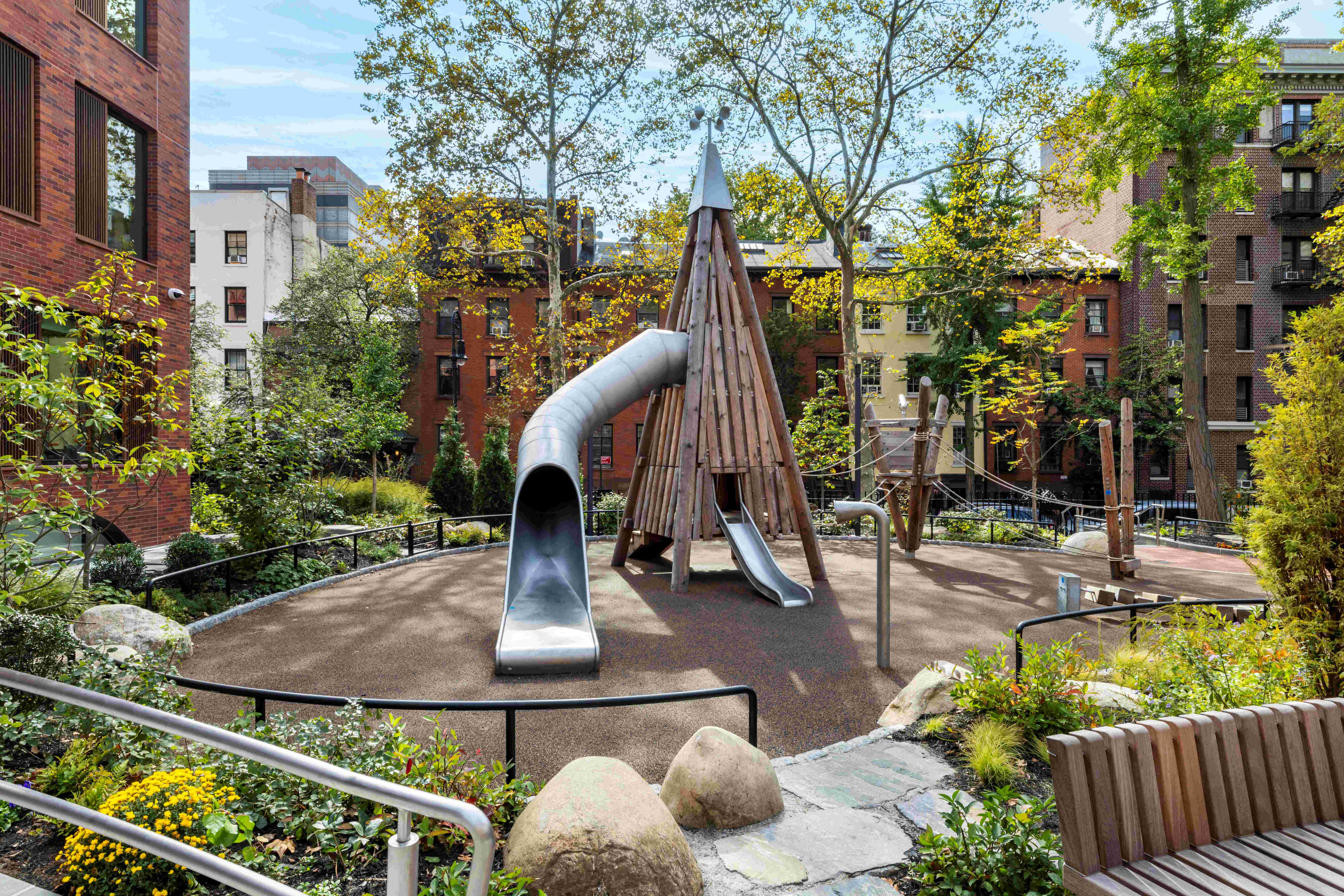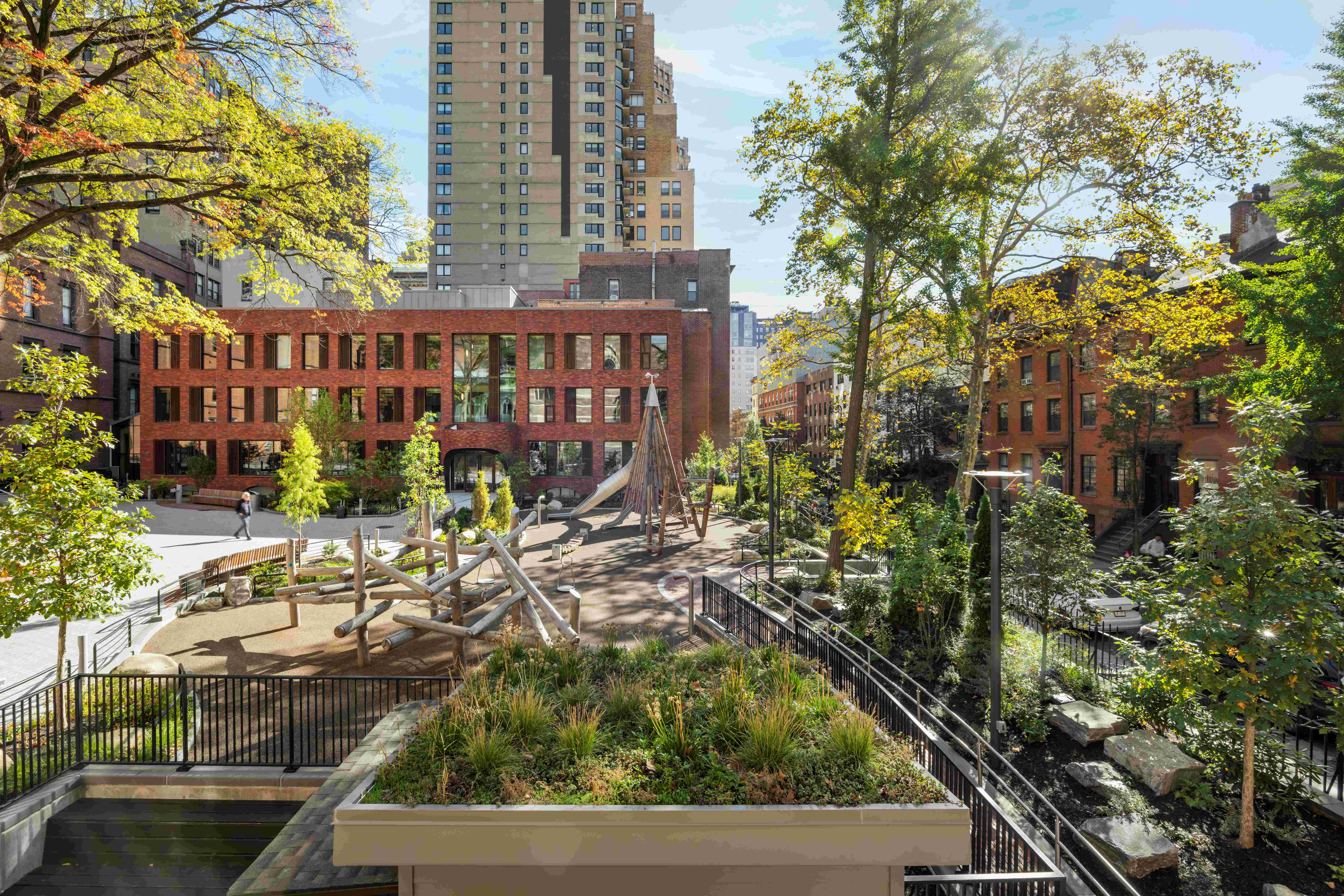 Alterations to the central garden space include the removal and relocation of existing trees, an extension of the existing patio entryway, new pavement throughout, a redesigned playground and new plantings.